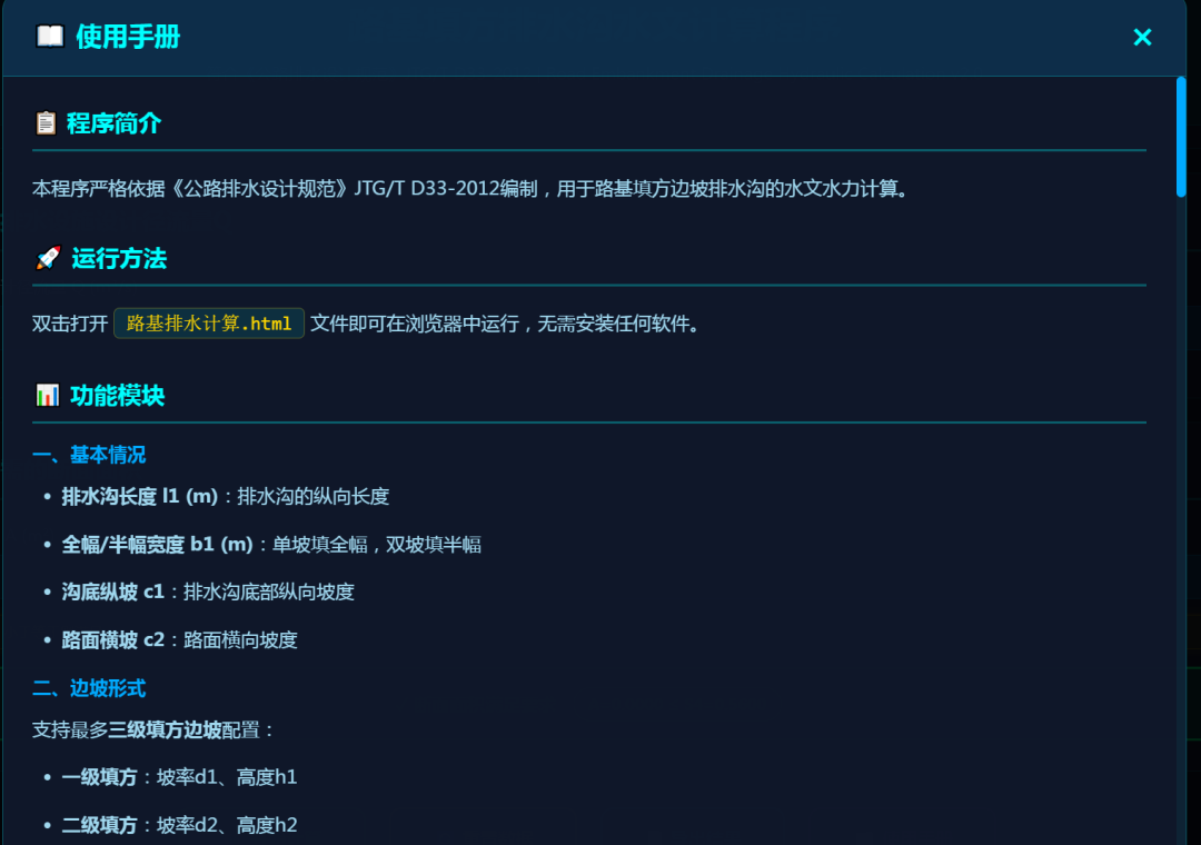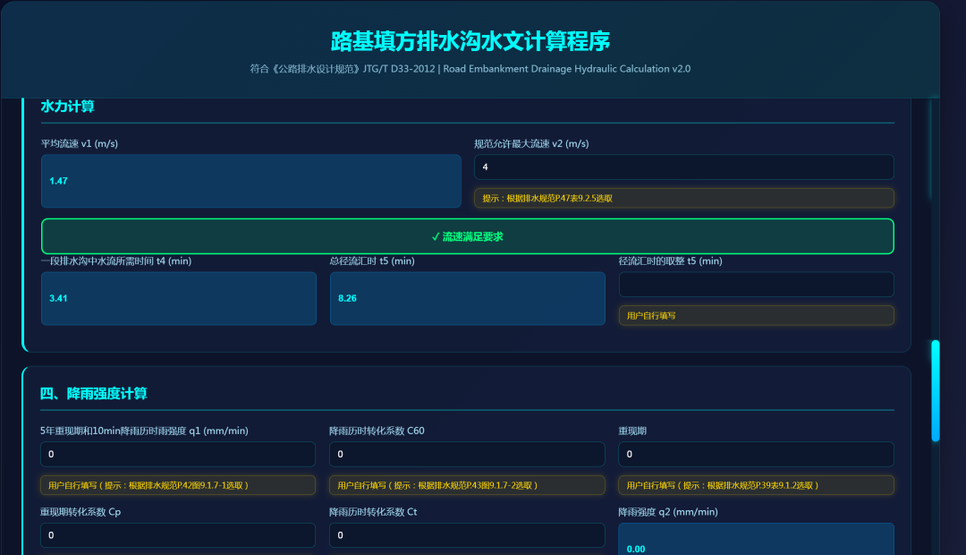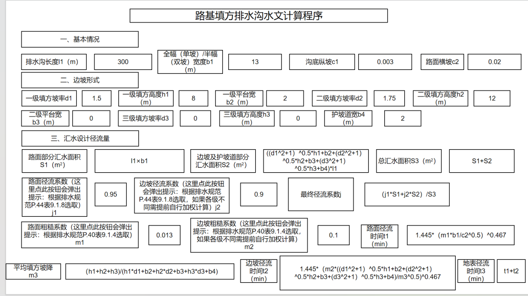 智能化平台继续添加新成员,路基路面排水设施水文计算程序上线!包含排水沟、边沟、截水沟、平台排水沟、拦水带及急流槽间距计算等。完整的计算框架,结合规范与近两年的实际情况,对路基范围重现期有新要求的区域同样适用,流速检测、断面检测等一应俱全,弥补缺少真正的属于路基路面排水设施计算软件的空白! 从开发框架到使用手册一应俱全,原理公式全部依托规范!最后特别感谢三交院周家文哥、冯军强哥当年对我排水计算的相关指导,word开始,excel到程序,这就是传帮带!