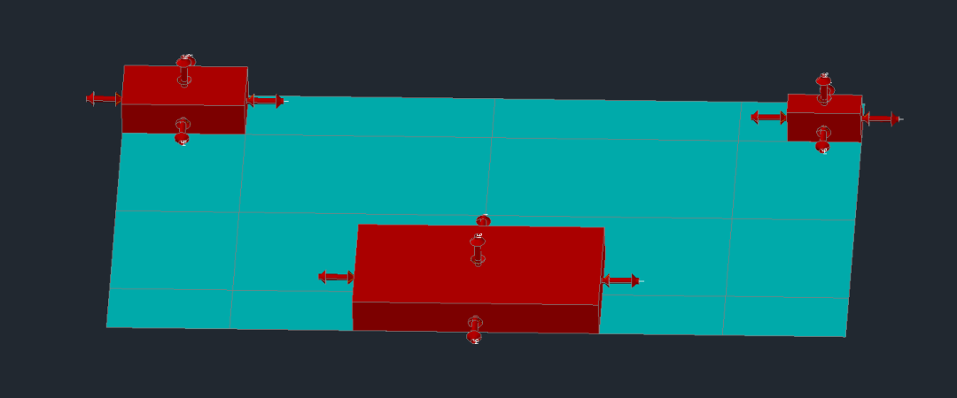 案例描述:辐射环境冷黑背景温度为4K,三个单机和散热板干接触,对三个单机施加Heater将单机温度控制在想要的温度。热模型如图所示。