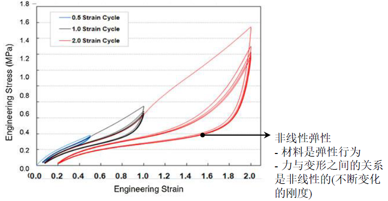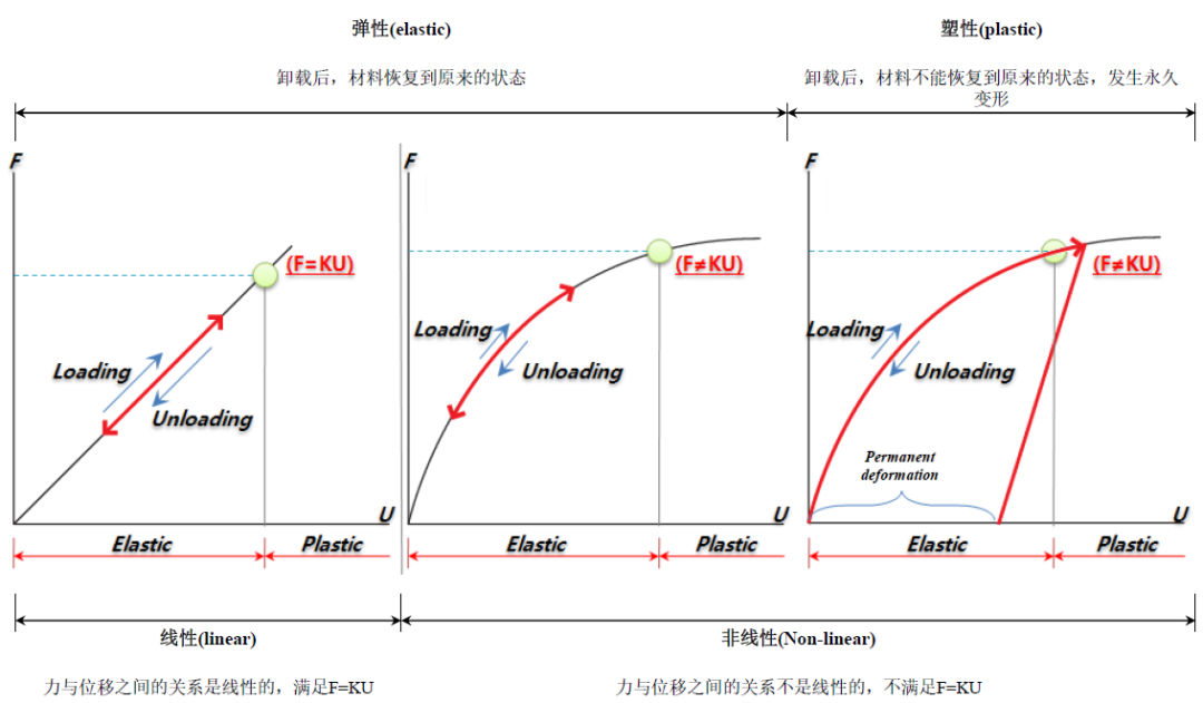 一般来说材料处于弹性阶段时,应力应变关系是线性的。不过像弹性材料橡胶 它的应力应变关系始终是非线性的,称为非线性弹性,因此,在很多情况下弹性材料不一定会体现线性行为。绝大多数的金属材料,在弹性区域本构关系是线性的。当应力超过屈服应力时会表现出材料的非线性行为。