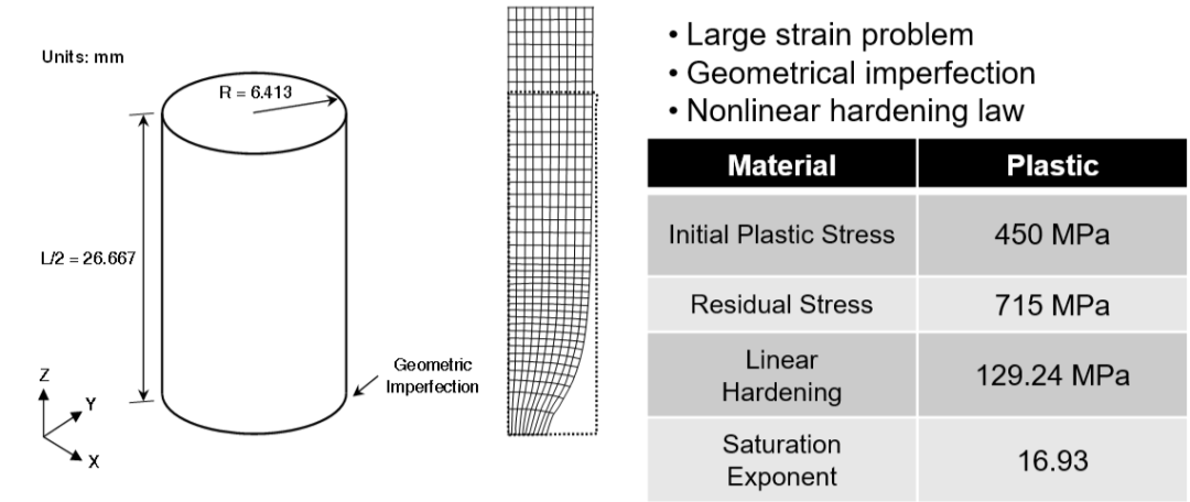 Large strain, geometrical imperfection, elasto-plastic material with nonlinear hardening
