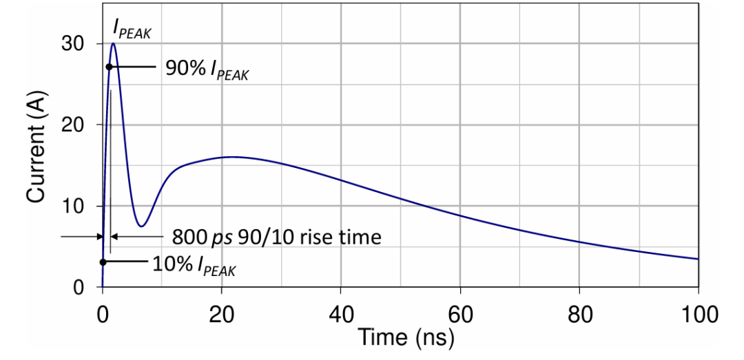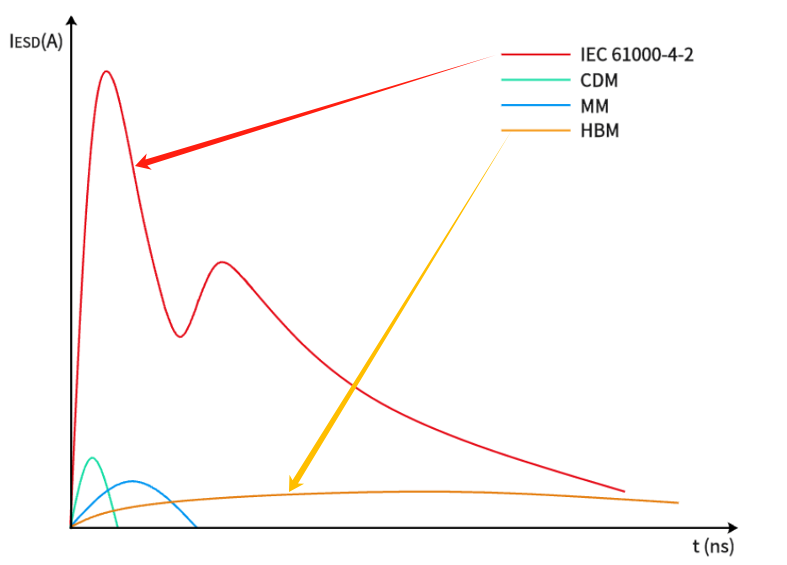 图 3 符合 IEC 61000-4-2 标准的 4 级 (8kV ESD) 波形 图 4 芯片级ESD和系统级ESD放电脉冲波形示意图 在测试方法上,芯片级ESD是在固定夹具上测试,芯片处于不上电状态。而系统级ESD的测试则 是将芯片焊接在PCB上,测试过程中芯片可能处于上电状态,测试引脚组合也会因系统电路连接 差异而不同。 2、放电路径不同
