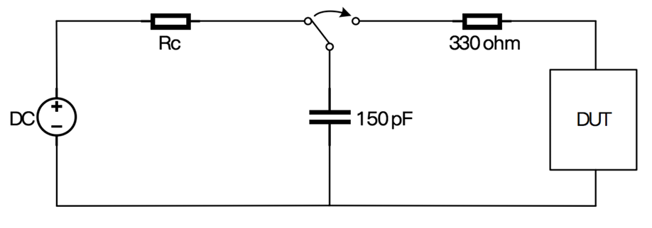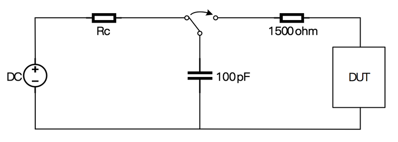 芯片级的ESD测试:一般指的是人体模型(8kV HBM),如下图1所示:其充电电容100pF,放电电阻1.5kΩ。它模拟的是人身体带电后,通过手指(或工具)直接触摸芯片引脚时的放电情况。它的放电电流上升时间较慢(约10纳秒),能量通过一个较大的电阻(1.5kΩ)释放,电流相对较小,持续时间较长(几百纳秒)。实际产品的ESD测试:如最常见的8kV IEC 61000-4-2模型,如下图2所示,其充电电容150pF,放电电阻330Ω,它模拟的是人手持金属工具(如钥匙、螺丝刀)对设备放电的场景。这个模型也叫“枪 模型”。它的特点是放电电流上升时间极快(约0.7~1纳秒),峰值电流非常高(8kV时峰值电流可达30A!),但持续时间很短。