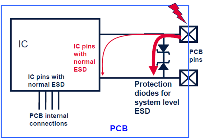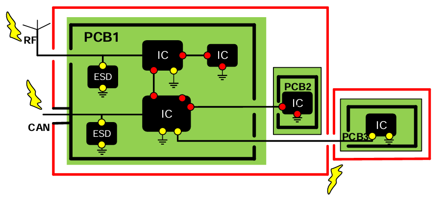 芯片级测试:ESD脉冲是直接施加在芯片的每一个引脚上,测试的是芯片内部保护电路的能力。电流路径相对简单和明确。产品级测试:ESD脉冲是施加在产品的外壳、接口、缝隙等地方。静电电荷不会直接进入芯片引脚,而是会通过机壳耦合到内部电路板,并在电路板的走线上产生感应电流和电压,通过空间辐射耦合到敏感的芯片引脚上。这意味着,即使芯片本身的保护电路很强大,但ESD能量可能绕过它,通过其他路径如下图 5(如电源平面、I/O线、寄生电容)对芯片造成伤害。3、系统级积累效应