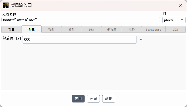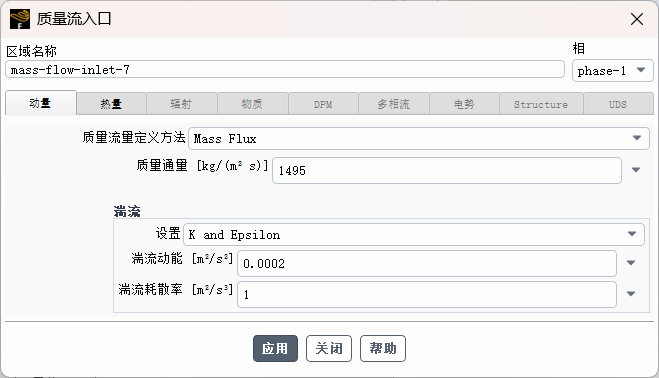首先对质量流入口相一进行设置,质量通量设置为1495,热量设置为555K,具体设置如下图: