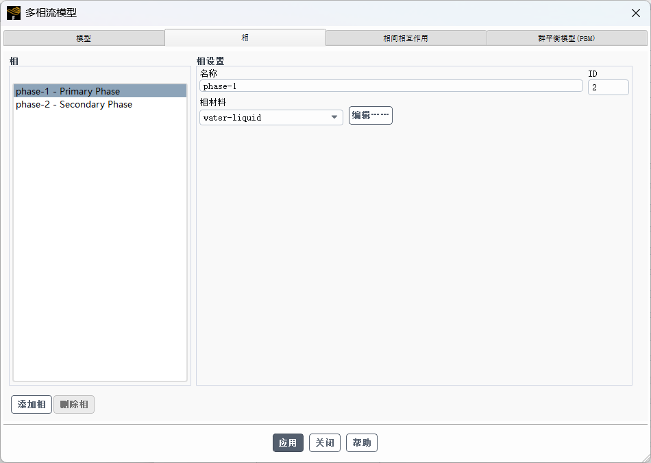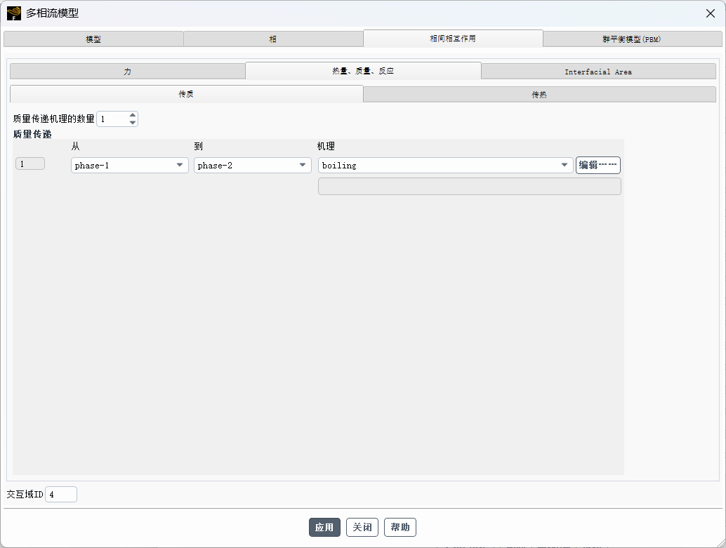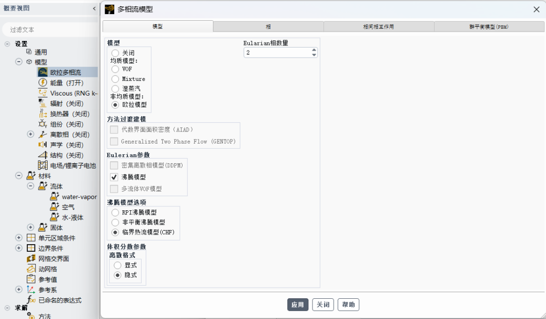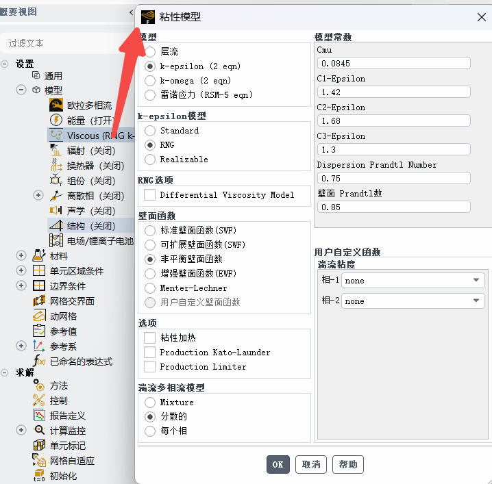 首先进行多相流模型的设置,设置过程十分繁琐,其次设置湍流模型为ke RNG模型,相关设置如下图所示: