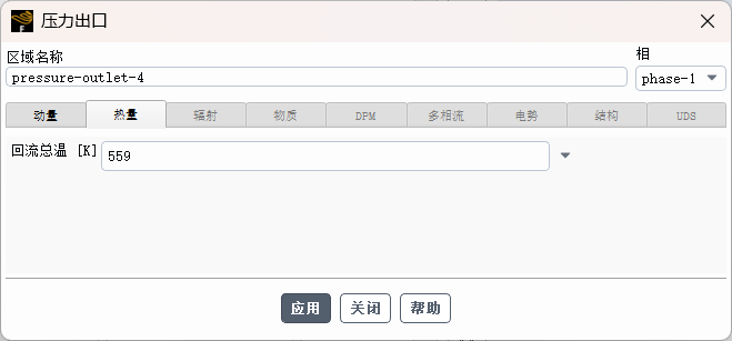 对压力出口相一进行设置,热量设置为559K,具体设置如下图: