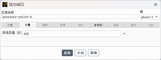 对压力出口相二进行设置,热量设置为925K,具体设置如下图