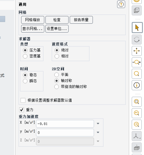 首先导入网格,然后勾选为稳态计算,并选择压力基求解器。并选择轴对称选项。