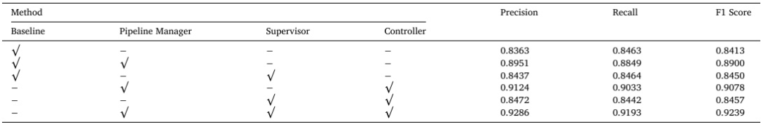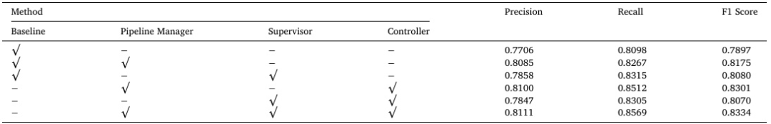 表7显示了使用连铸设备结晶器部分数据进行消融实验的结果。当基线模型包含管道管理器和监督器模块时,精确率,召回率和F1分数得到改善。此外,控制器和管道管理器模块的组合优于仅使用管道管理器模块的基线模型。然而,控制器和主管模块的组合与只有主管模块的基线模型相比,性能略差。然而,同时使用这三个模块的性能要优于基线模型、带有管道管理器模块的基线模型和带有主管模块的基线模型。这证明了所提的管道管理器、监督器和控制器模块的有效性。