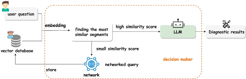本研究提出,LLM作为具有本地知识库和网络搜索的决策者,为诊断故障的原因提供可读的解释,如图8所示。首先,将用户的问题嵌入并与存储在向量数据库中的领域故障知识进行匹配。如果存在相似度相对较高的片段,则生成诊断结果。在相似度较低的情况下,进行网络查询,获取问题的相关信息。然后将答案存储在向量数据库中,补充现有知识,并能够为用户生成所需的结果。