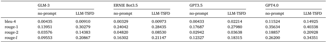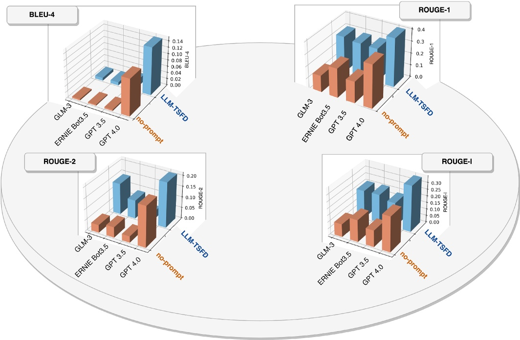 表8说明了在所有四个公开可用的LLM中,所提的prompt方法优于无prompt方法的性能。为了更直观地观察表8的内容,我们用三维直方图(图17)对无prompt法和LLM-TSFD法进行了对比。其中,蓝色条表示提出的LLM-TSFD方法,橙色条表示无prompt方法。图17清楚地显示,在rleu-4、rouge-1、rouge-2和rouge-1指标区域,LLM-TSFD条的高度始终超过无prompt方法的高度,表明我们提出的模型生成的答案质量更好。