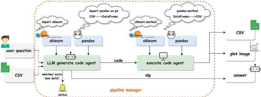 图5 LLM作为数据处理的管道管理器:LLM结合一些Python库进行数据处理,生成完整的代码内容。在本地环境中执行代码,然后生成所需的答案、CSV文件、图像等。