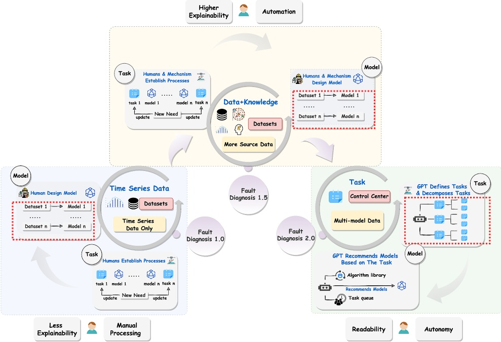FD1.0的特点是采用数据驱动的方法,依靠手动和自动化的方法来处理来自传感器的时间序列数据,以供人类决策。FD1.5的后续发展以更自动化的方式整合了数据和知识,使处理各种类型的数据成为可能,并增强了人类对模型输出的理解。随着LLM的出现,FD2.0时期现在以用户的任务分解流程为主导。模型具备自主赋能和自反馈调整能力,在处理大规模复杂问题和多模态数据处理任务的同时,节省了大量资源。此外,LLM增强了人类对结果的可读性,从而在一定程度上提高了理解能力。