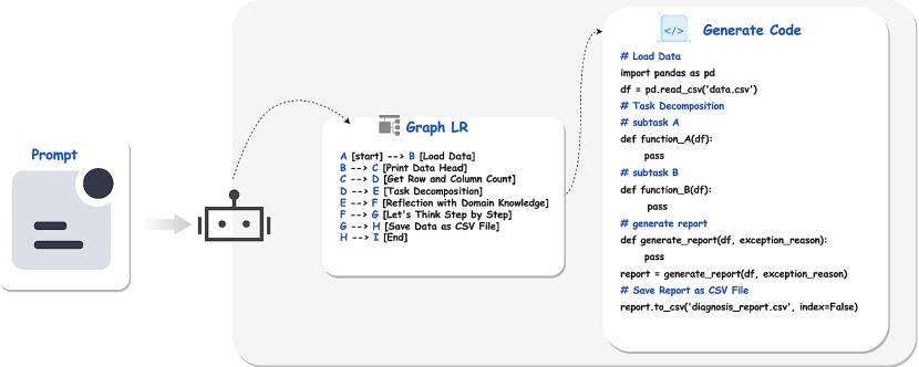 图9 以数据处理为例,生成prompt LLM代码的过程:在prompt的指导下,对用户的需求进行分析并分解为子需求。LLM对这些子需求进行相应的优先级排序和处理。如果问题与数据处理有关,LLM的最终输出将是处理此类数据的相应代码。