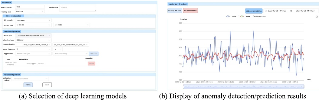 图14(a)示出了平台的模型配置模块。后端为十个预训练模型提供接口,用于异常检测和预测。为了有效地检测异常,用户必须选择合适的深度学习模型。然而,由于他们不知道哪种模型会产生更好的结果,他们只能通过不断的试错来获得最优的结果。图15(a)描述了LLM如何根据用户输入要求推荐算法。相比之下,图14(b)的故障线图并没有为用户提供可读的信息。图15(b)展示了LLM如何通过将流行场景与领域专家知识相结合来解释警告结果,从而增强可读性。
