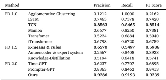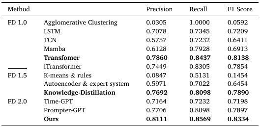 本文使用精确率, 召回率和F1分数作为评价指标来综合评价和比较所采用方法的性能。此外,本文还将所提出的方法与11种公开可用的时间序列异常检测方法进行了比较:Agglomerative Clustering (Müllner, 2011), Long Short-Term Memory (LSTM) (Karim et al., 2018), Temporal Convolutional Networks (TCN) (Y. He & Zhao, 2019), Mamba (H. He et al., 2024), Transfomer (Wen et al., 2023), iTransformer (Liu et al., 2024), Kmeans& rules (Budiarto et al., 2019), Autoencoder& expert system (Valtierra-Rodriguez et al., 2023), Knowledge-Distillation (Pol et al., 2023), Time-GPT (Garza et al., 2024), and Prompter-GPT (Alnegheimish et al., 2024)。这些指标从不同的角度评估了方法的性能,提供了更全面、更精确的比较结果。