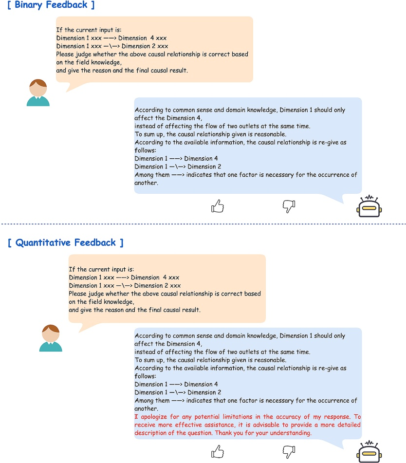 图12 使用LLM的因果关系校正操作过程:LLM通过使用二进制和定量反馈机制对其输入的因果关系进行校正。前者提供答案是否正确的信息,而后者则通知LLM它提供了不充分的响应,需要用户的额外输入。