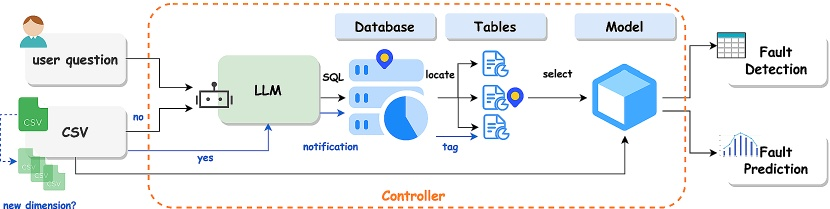 图7 LLM作为模型调度过程的控制器:用户向系统提供需要处理的需求和数据。然后LLM算法将此输入与SQL数据库进行匹配,以推荐匹配度最高的模型。随后,被推荐的模型输出故障检测/预测结果。