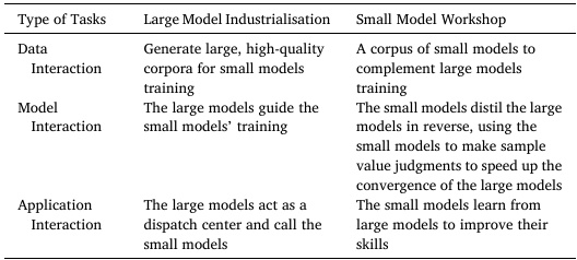 随着LLM的快速发展,出现了GPT3.5/4、ChatGLM、Vicuna等具有自主认知能力的生成模型。这些具有数十亿个参数的模型被分类为大模型,而具有数百万个参数的模型被分类为小模型((S. Li et al., 2022)。与小型模型相比,大型模型在推理能力、计算能力和泛化方面表现出了显著的性能((L. Li, Zhang, et al., 2023; Shridhar et al., 2023)。尽管大型模型的出现改变了分散的模型开发模式,即单个AI应用场景中的多个任务需要多个模型的支持,每个模型都需要算法开发、数据处理、模型训练和调优(Y.-F. Li, Wang, et al., 2023)。尽管如此,小型模型仍然具有显著的优势,例如训练成本低、尺寸较小、易于维护。因此,可以采用“小模型车间”和“大模型工业化”相结合的方法,在考虑到这些模型各自优势的情况下,充分挖掘这些模型的潜力。