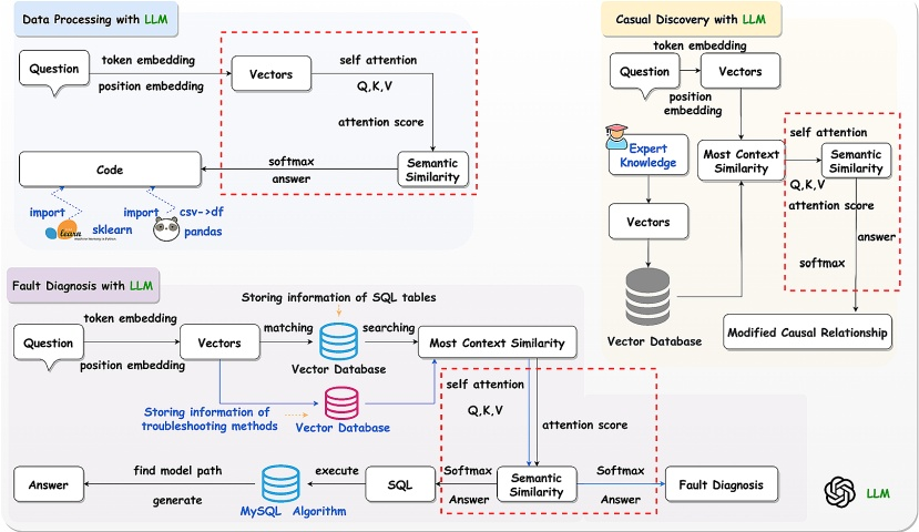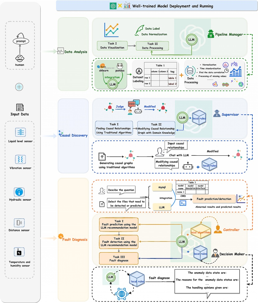 图4 LLM在故障诊断2.0中的作用价值:对于数据处理,LLM的作用类似于管道管理器。对于因果发现,LLM扮演的是监督者的角色。最后,对于故障诊断,LLM同时承担控制器和决策者的角色,以有效地诊断故障。
