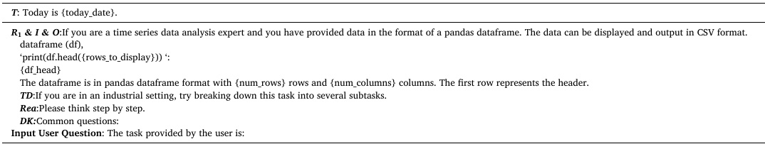 在LLM中,prompt的添加通过提供条件约束来修改概率空间,这些条件约束引导模型生成条件相关的输出。这个过程增强了语言模型的响应与用户期望之间的一致性,从而提高了其性能和泛化能力。此外,准确的prompt对于使LLM有效地发挥作用并产生令人满意的结果起着至关重要的作用。然而,重要的是要注意,LLM是一个广义模型,缺乏特定领域的理解。他们需要在一个知识领域内的指导,才能知道如何解决问题。为了解决行业内时间序列数据中的故障诊断问题,本文提出了一个prompt结构来指导任务驱动的开发。Prompt设计结构如式(7)所示。