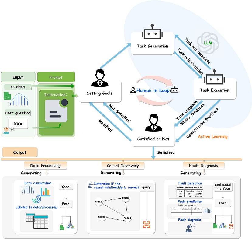 使用LLM进行人在环任务驱动的时间序列故障诊断的框架如图2所示。该模型在整个过程中依赖于两个主要输入:用户prompt和来自中间层的工业时间序列数据。用户prompt由一系列指令和问题组成。一旦经过人在环的LLM处理,就可以输出期望的结果。在数据处理任务中,将输入数据可视化,预处理后的数据以CSV格式本地存储。在故障检测任务中,输出的是修正后的因果关系。在故障诊断任务中,模型推荐预测/检测模型,并提供故障检测和预测的结果。在这个过程中,LLM在知识库中搜索最相关的内容作为输出。当遇到新问题时,LLM可以在网络中搜索找到合适的解决方案。
