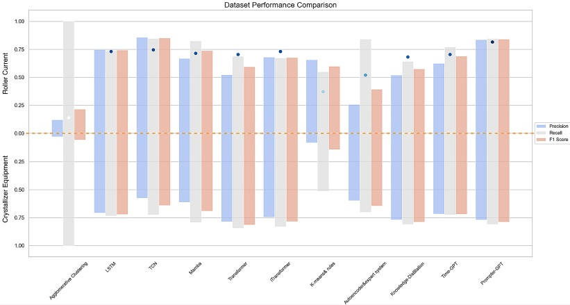 本文比较了两个数据集上11个公开可用模型的平均F1分数,如图16所示。散点图显示每个模型的平均F1分数,颜色越深表示值越高。Prompter-GPT模型平均得分最高,可作为消融实验的基线模型。此外,当使用大型语言模型作为故障检测的决策器时,我们提供了对结果的解释性文本分析,这与管道管理器,监督器和控制器模块的评估方法不同。因此,本节的消融实验主要关注管道管理器、监督器和控制器模块在精确率、召回率和F1分数方面的性能,以评估它们在基于从连铸设备收集的数据的故障检测中的有效性。
