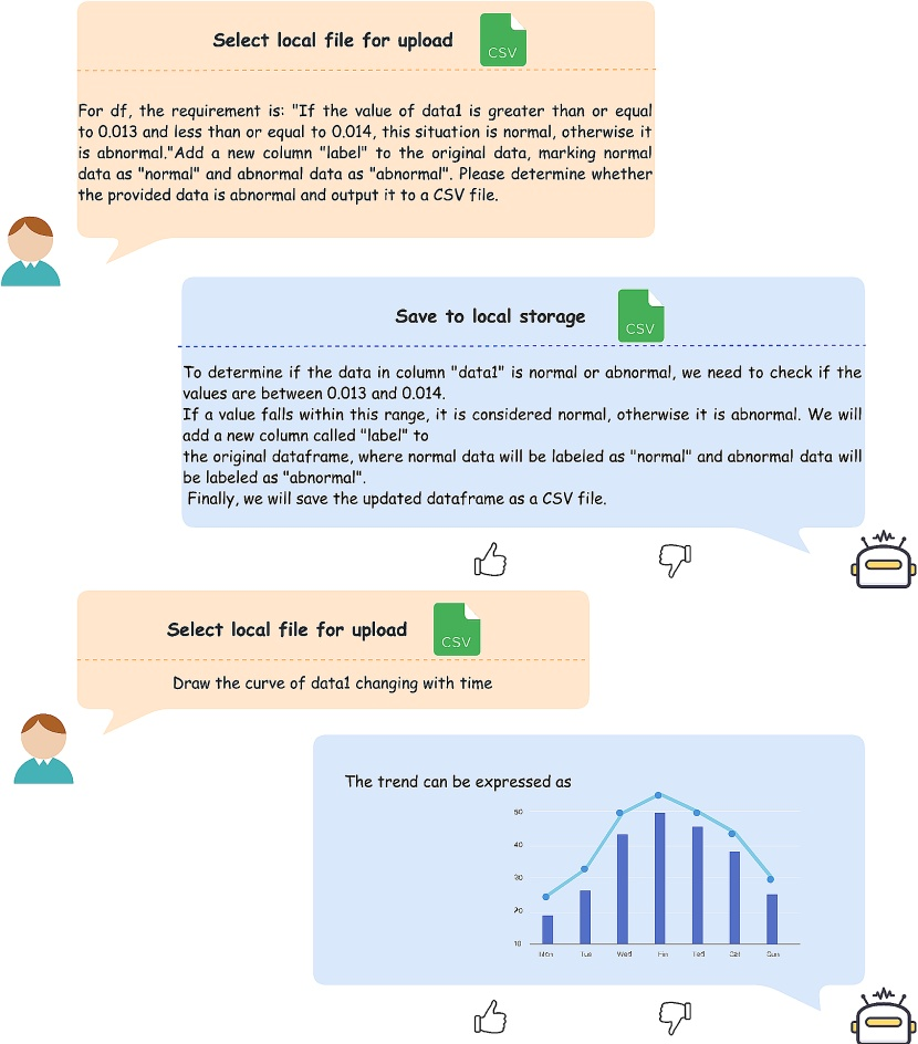 平台根据LLM建立的角色进行划分。最终的故障诊断模块包括两个关键组件:故障模型的选择和诊断信息的问答,涵盖了分配给LLM的两个角色。LLM系统的第一个模块作为数据管道管理器。用户上传一个CSV文件,其中包含机械设备上某个传感器在特定时间段的数据,并指定要处理的任务,以获得相应的输出。传统方法需要人工经验来设计数据处理方法,需要领域工作人员了解标记数据的相关上下限限值,与此相反,LLM可以取代这些任务。用户将任务输入到LLM中,然后LLM将其分解为子任务,提供调优代码的反馈,在本地执行,根据此经验添加相关的领域经验进行标记,并允许用户确定他们想要的输出格式。用户可以通过告知LLM他们喜欢的显示类型,将任何格式的输入数据可视化。此外,使用历史信息作为参考点,LLM确定当前输入文件中是否存在新的维度数据;如果存在,后续模型将相应地进行标记,并发出有关维护或更新的通知。图11显示了使用LLM可视化显示功能在钢铁冶金领域执行处理设备相关CSV文件相关操作时的用户对话过程。如果用户对LLM的初始输出产生的结果不满意,他们可以提供反馈,这将促使LLM进一步响应,直到获得满意的结果。