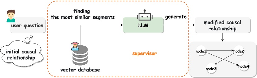 图6 LLM作为因果纠错的监督器:用户输入初始的因果关系,结合专家知识库对因果关系进行纠错,最后输出纠错的结果。