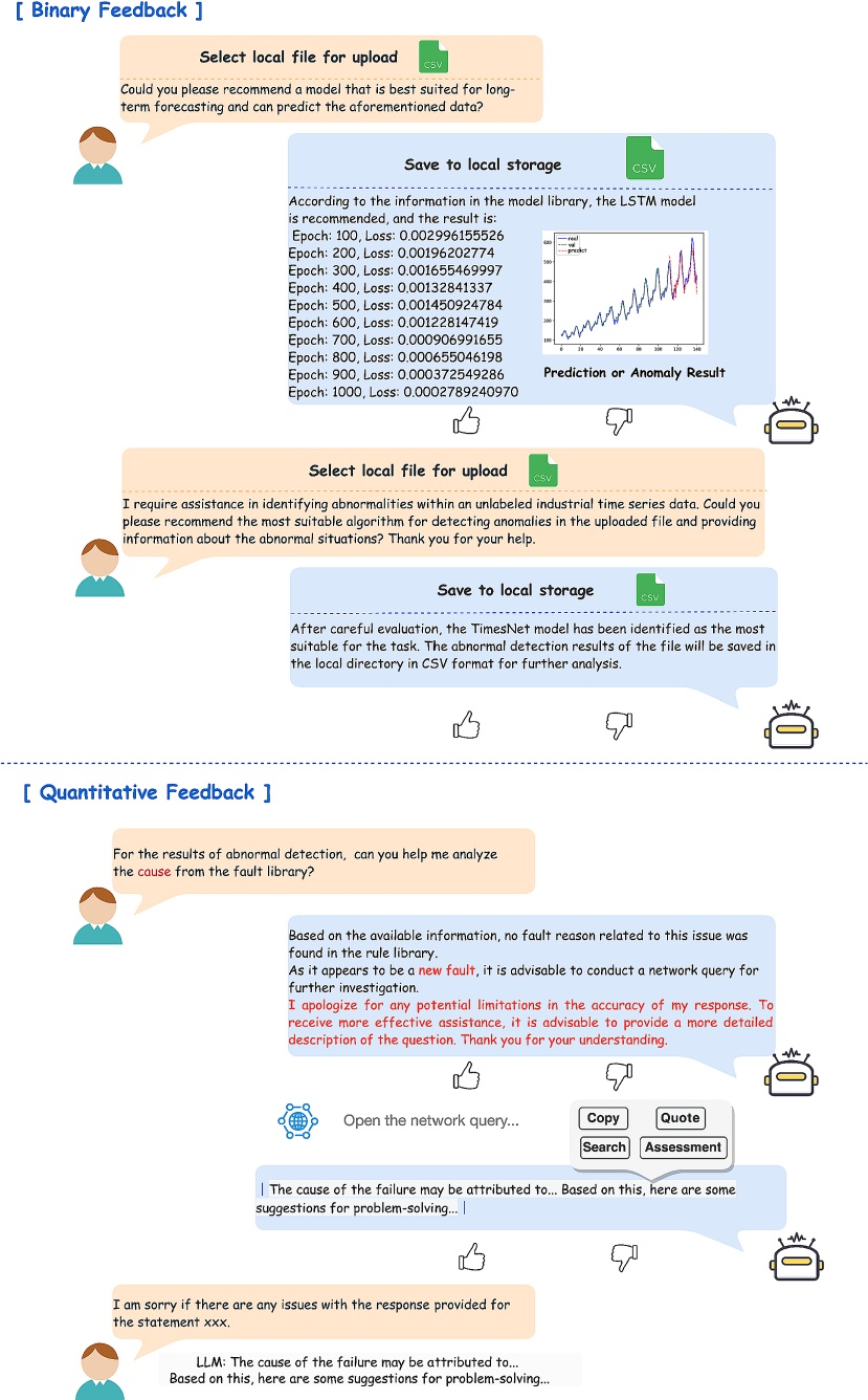 第三个模块是故障诊断,包括LLM控制器和决策器。在传统方法中,专业操作员设计一个模型,并提供一个描述供用户选择,包括每次使用需要修改的输入和参数。然而,使用LLM,用户只需要描述任务,LLM将他们的描述与本地算法库中最合适的模型相匹配。然后,用户选择输入数据通过模型接口运行,然后获得所需的结果作为输出。图13说明了这个过程。故障诊断模块包括故障检测模型推荐、故障预测模型推荐和故障诊断建议三个子模块。在提出检测或预测故障的模型时,LLM检索数据库,根据用户需求推荐合适的模型。如果用户对推荐的结果不满意,他们可以提供二进制反馈(满意/不满意)。在故障诊断过程中,LLM在数据库中搜索可能提供答案的相似片段。如果没有找到,则表明用户问题与知识库内容之间的相似性较低,要求提供更详细的问题描述。此外,每个答案有四个对话选项:复 制、引用、查询和评估。“复 制”允许用户将答案复 制到剪贴板上。通过选择“引用”,用户可以跨长度进行诊断。通过从上下文中选择一个特定的回应,引用它,然后提出一个问题,引用和查询可以传输到LLM中进行进一步的分析和响应。图13在引用LLM之前的回复或提供二进制反馈(“评估”)时显示了这些选项以及网络搜索功能(“查询”)。
