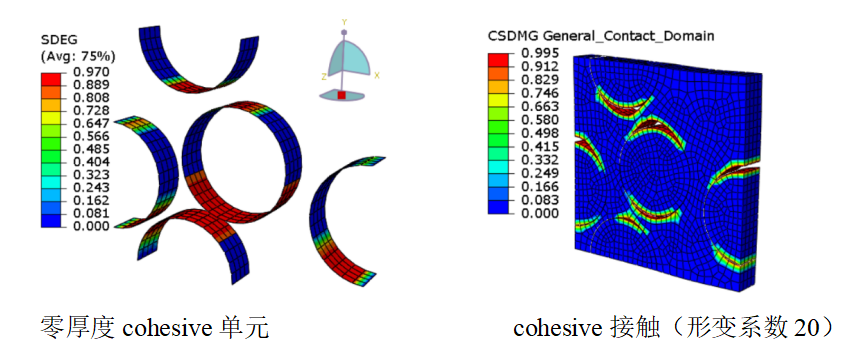 刚度一致性:零厚度 cohesive 单元与 cohesive 接触的建模方案刚度完全一致,确保宏观性能预测的稳定性;