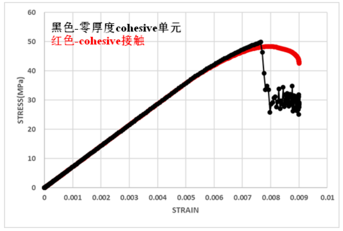 应力应变曲线如下,可以看出:二者刚度相同;采用零厚度cohesive单元的最大应力为49.8MPa,采用cohesive接触的结果为51.4MPa,误差为3.11%。