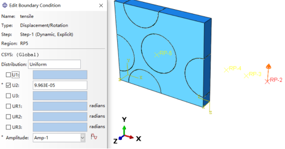在对应参考点上施加位移边界条件,本文在Y方向进行拉伸,设置如下图: