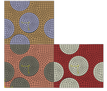 几何结构设计:采用纤维与基体的代表性排布方式(如课程中四纤维 - 基体构成的 RVE 模型),确保微观结构能够反映宏观材料的统计特征,纤维体积分数、界面层分布等参数需与实际材料一致;