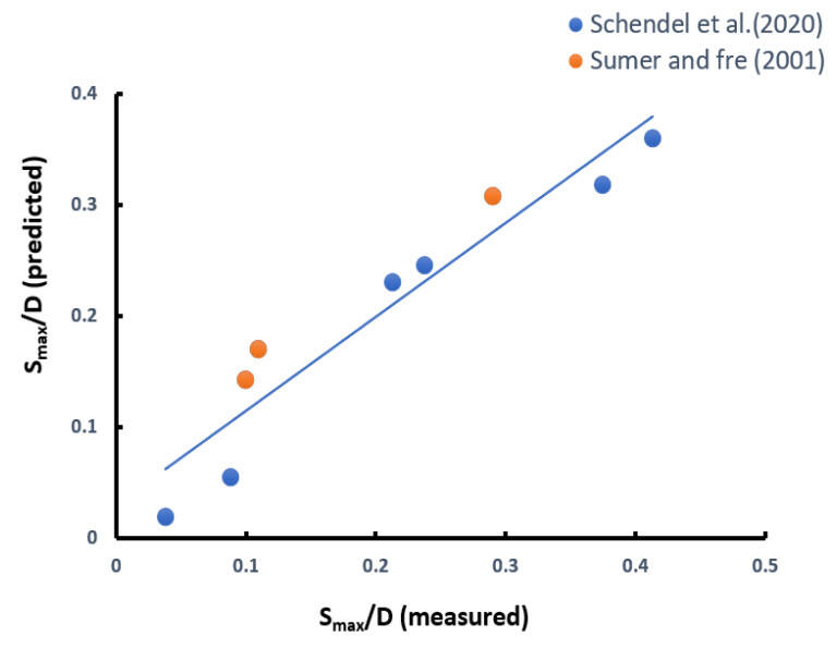 图5 数值模拟的冲刷深度与 Sumer 和 Fredsøe、Schendel 等人的实验结果相比,呈现出很好的一致性