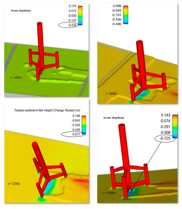 (3)斜撑与主柱作为阻碍物,增加了其下方水流的加速度。这提高了扰动的强度和对海底的剪切应力,进而导致更多的颗粒被动员和传输,结果导致该处更严重的冲刷。