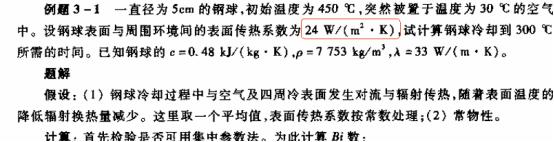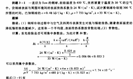 集总参数求解的思路即通过先判定Bi数大小,是否满足使用集总参数法(即将整个球的温度简化为一点的温度,忽略内部的温度分布),随后通过过余温度求解公式计算钢球从450℃冷却到300℃的时间为0.158h。
