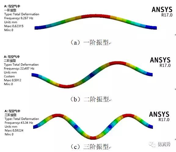 管子在流体中的振型与在空气中的振型一致,在流体中的固有频率比在空气中低;不同环境下得到的管子各阶固有频率之间的比值一致,均为 。