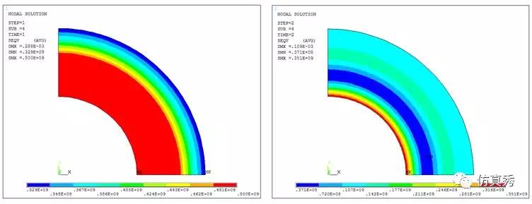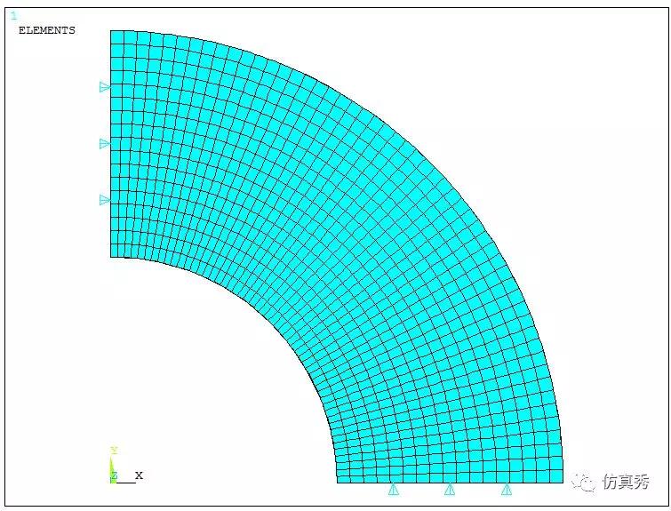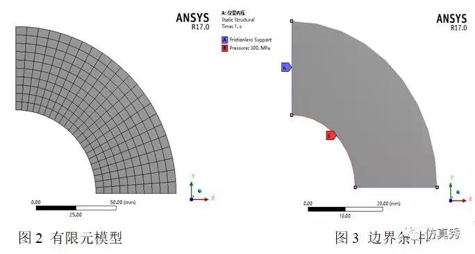 采用2D平面应变分析,根据对称性取四分之一模型进行模拟。创建新的圆柱坐标系,施加对称约束或者无摩擦约束,在内孔表面施加压力载荷,选取半径作为路径方便结果后处理。
