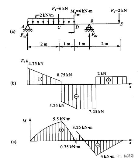 一根外伸梁受力如下,包括集中力、均布力、弯矩。对其进行静力学分析,求其支反力、挠度、剪力图、弯矩图。(详见《材料力学》王世斌主编,P102例3-4)