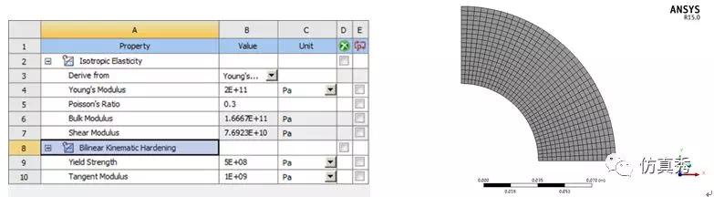 定义材料弹塑性,采用双线性随动强化模型。例子简化为平面应变问题,根据对称性,取圆筒四分之一并施加垂直于对称面的约束,指定载荷步数为3,分别模拟自增强、卸载和施加工作载荷三个过程。