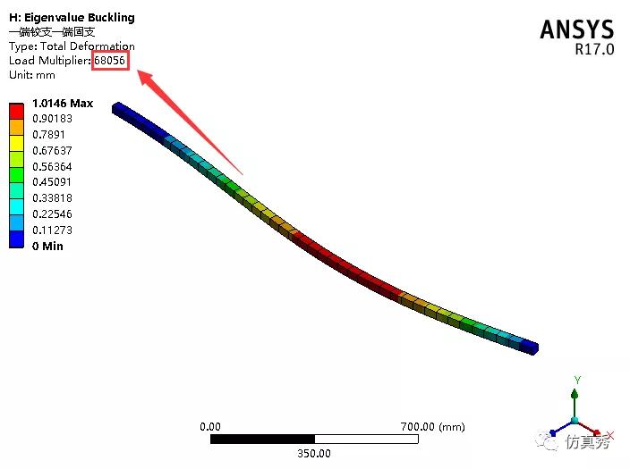 当一端铰支,一端固支时,得到模拟值为68056N。