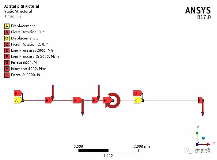 采用梁单元Beam188模拟,在DM草图创建四条直线生成一个线体并赋予截面。给梁施加简支约束,按照图1加载集中力、均布力和弯矩,如图2所示。