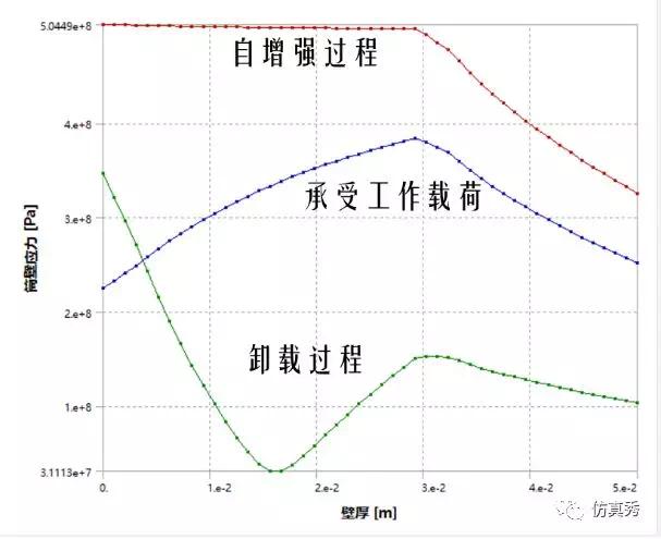 加载和卸载时,圆筒沿壁厚方向应力分布如下: