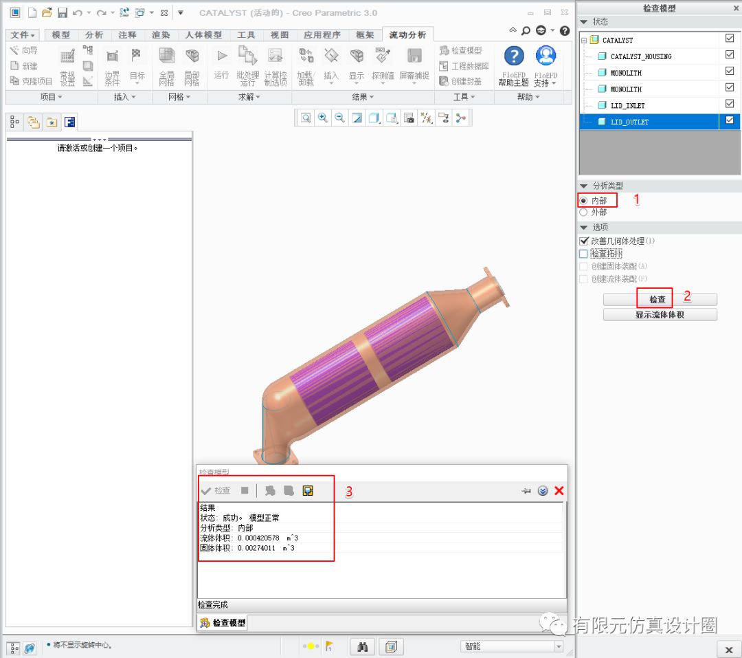 检查模型,选择内部分析类型,结果显示状态成功,模型正常。