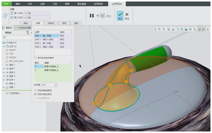 利用边界混合命令进行构建过渡曲面,要约束相切