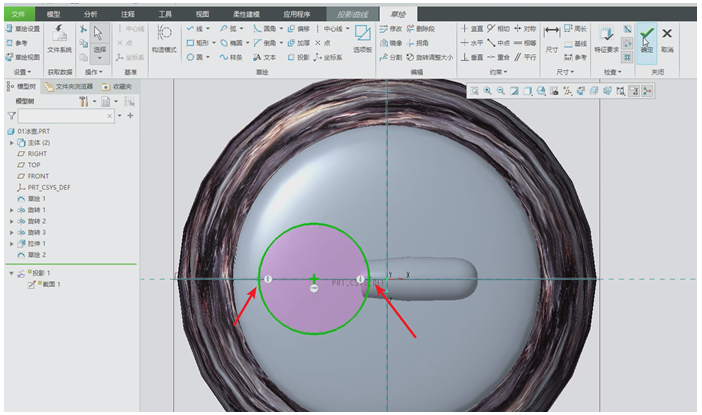 投影曲线,参考上一个曲线与面的交点,画圆,圆心在中心线上