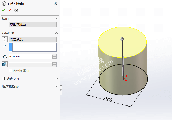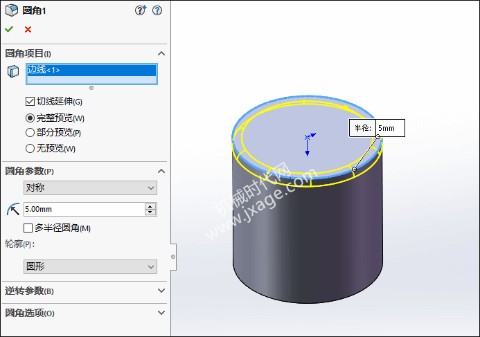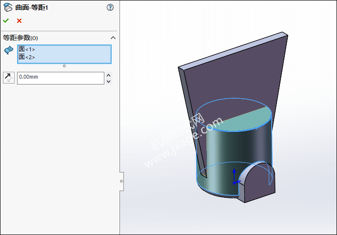 5.点击【插入】-【曲面】-【等距曲面】,选择拉伸1的圆柱面和顶面,设置距离为0mm。