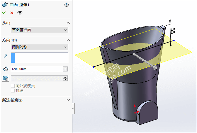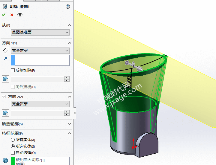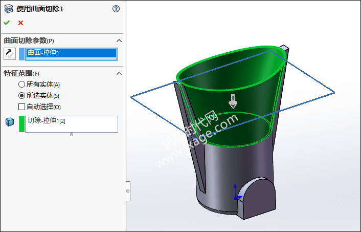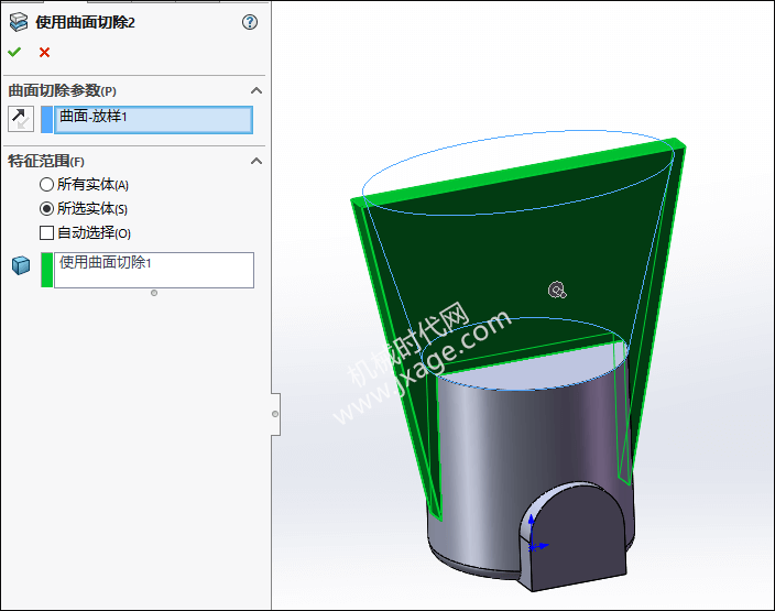 14.【插入】-【切除】-【使用曲面】,使用上一步的拉伸曲面对加厚的实体进行切除。
