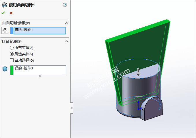 6.点击【插入】-【切除】-【使用曲面】,使用上一步的等距曲面对拉伸3实体进行切除。